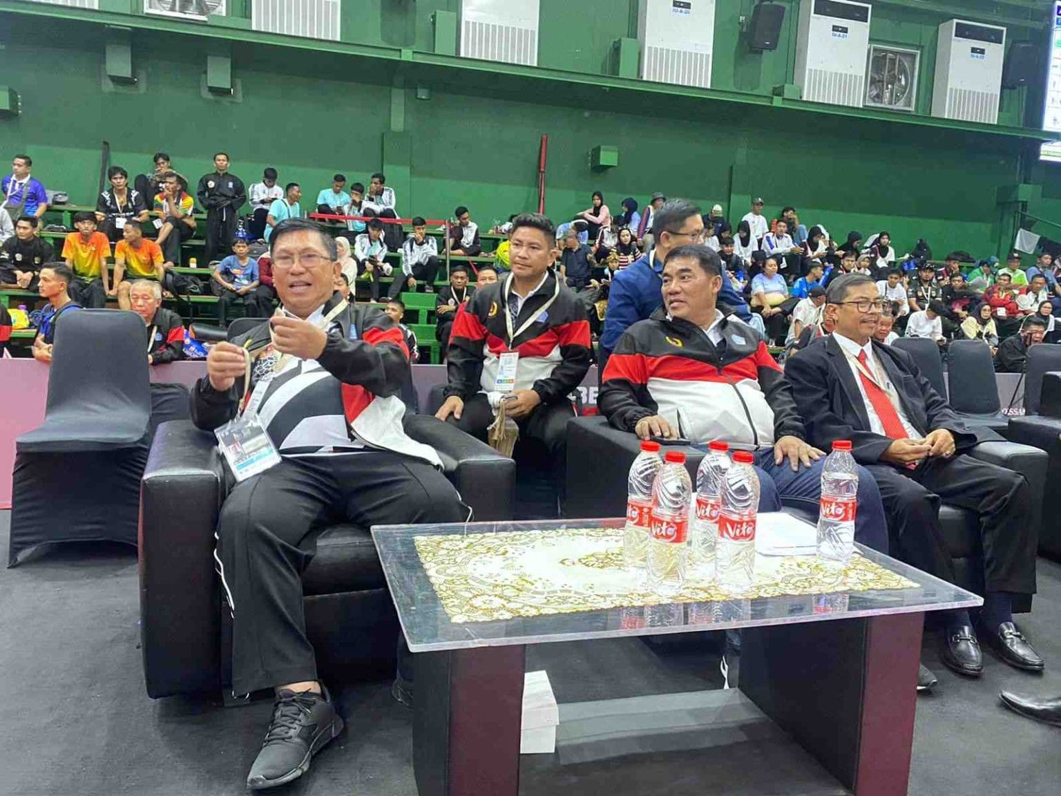 Terlihat, di arena lomba, Gubernur Yulius Selvanus menyaksikan langsung para atlit bela diri sulut berlomba.